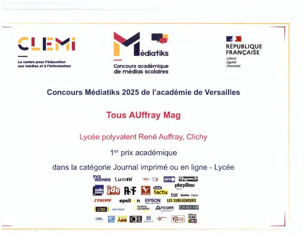 En attendant, les enseignants encadrant le projet du journal lycéen Tous Auffray Mag félicitent grandement tous les élèves ayant contribué, depuis son lancement en 2022, à faire vivre avec brio Tous Auffray Mag : mille bravos à toutes les rédactrices et tous les rédacteurs des sections professionnelles, technologiques et générales !